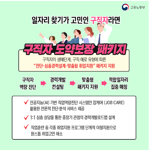 구직자들의 구직 애로 유형 및 생애 단계에 따른 진단 심층 경력 설계 맞춤형 취업지원을 패지지로 제공한다고 합니다.